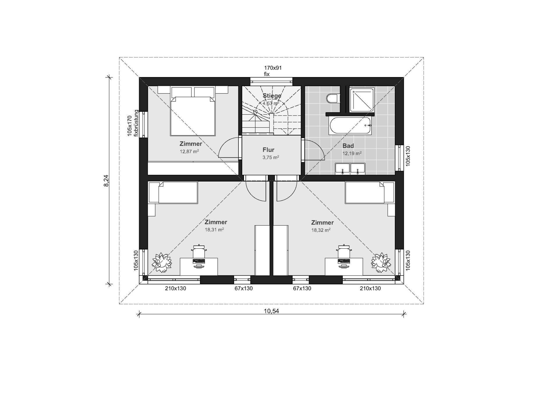 - Dachform: 25° Walmdach